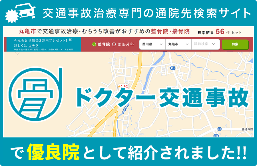 確かな施術の技術、および知識から丸亀市の皆様にご支持いただいております。その信頼の証として、口コミ評価は丸亀市でもトップクラスです。お身体に関するお悩みはまずは、当院にご相談ください。専門知識を持った院長が、お一人一人に合わせたオーダーメイドの施術を提供します。