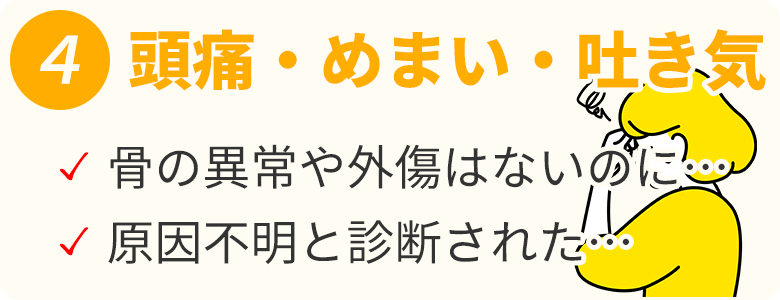 病院や整形外科で実施した検査で異常が見つからなかった方にも、当院では治療を行うことができます。骨折や血管の異常においては、MRIやレントゲン検査で把握することができますが、筋肉や骨格、神経のダメージについては把握することが難しいです。痛み以外にもめまいや怠さ、耳鳴りなどの長期的な不調に悩む方も治療を受けていただけます。