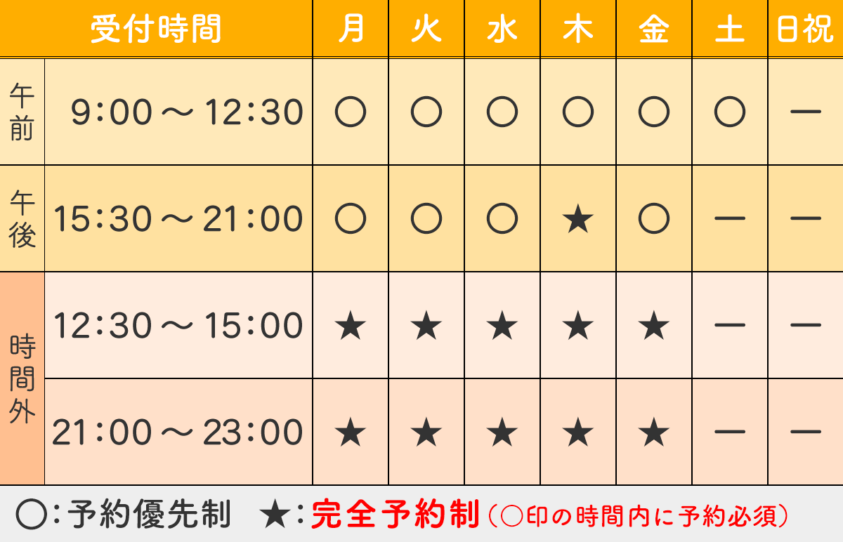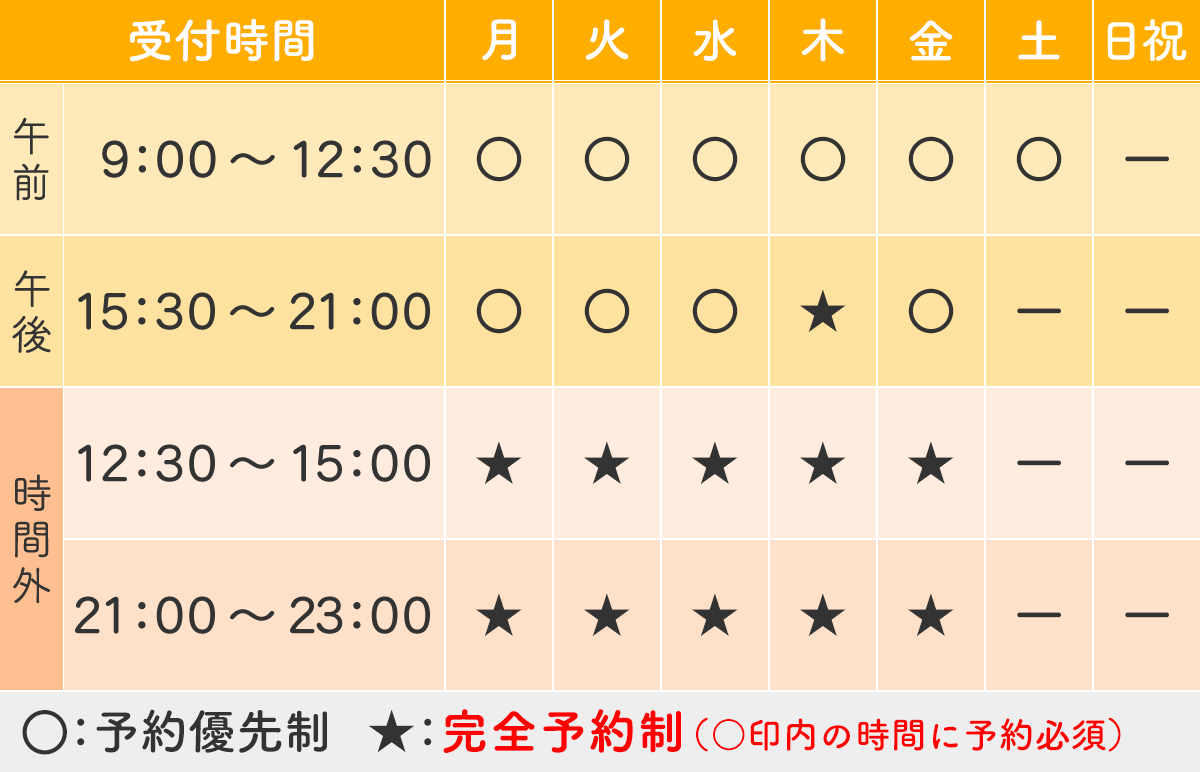 当院を利用される方には、交通事故後の方はもちろん、長時間のデスクワークや立ち仕事の方も訪れます。そのため、仕事帰りにも訪れやすい夜23時まで受付をしています。仕事で帰りが遅くなった日でも、お気軽にご利用ください。(時間外利用は事前予約必須)