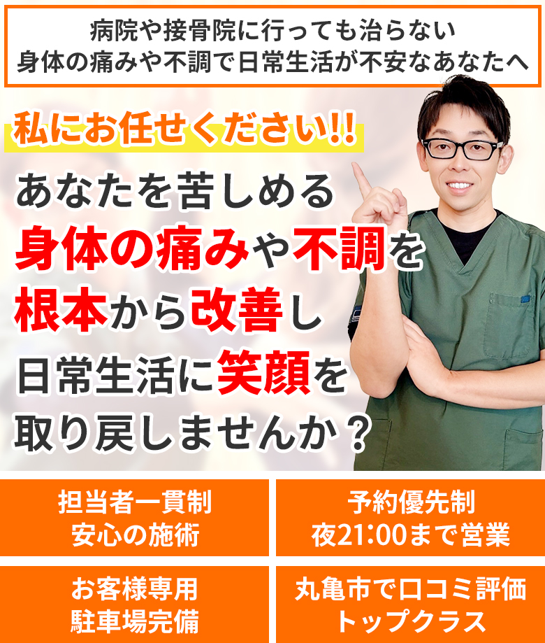 確かな施術の技術、および知識から丸亀市の皆様にご支持いただいております。その信頼の証として、口コミ評価は丸亀市でもトップクラスです。お身体に関するお悩みはまずは、当院にご相談ください。専門知識を持った院長が、お一人一人に合わせたオーダーメイドの施術を提供します。